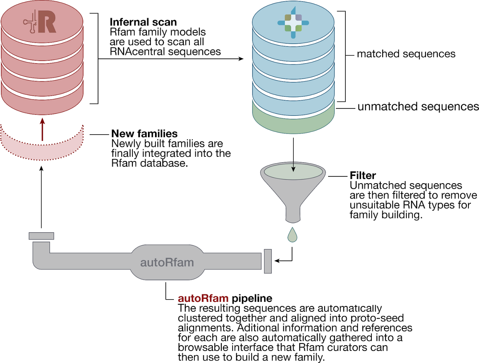 autoRfam is a pipeline that groups RNA sequences into potential new Rfam families. The idea was that we could use RNA sequences from RNAcentral that didn’t match any existing Rfam family as a source for new families.