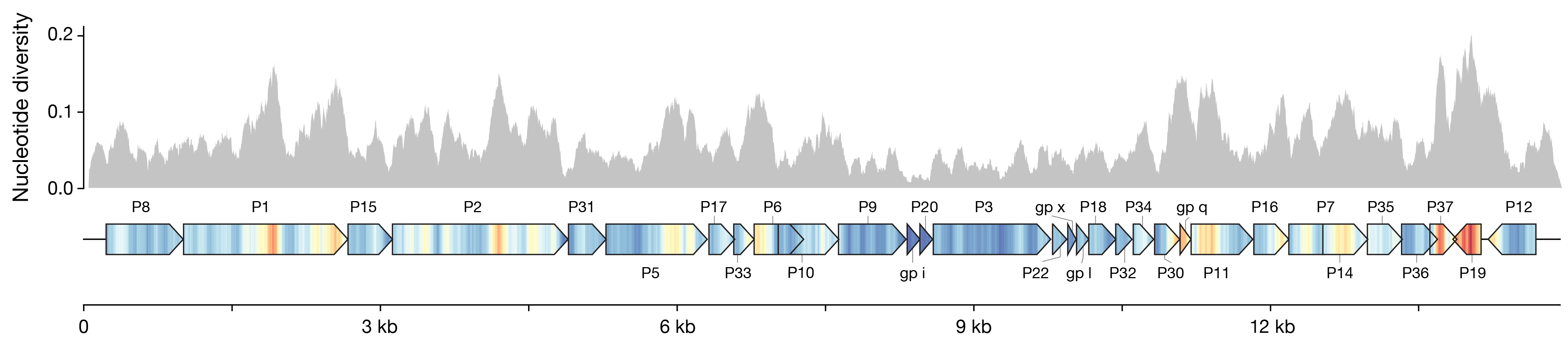We wanted to compare a bunch of closely related genomes and figure out which genes showed the most variation. Nucleotide diversity is a common metric for this, but I thought I could do a better-looking and more helpful way to show it than just dropping a histogram over the genes. I mapped the values to a color scale with matplolib.cm, and drew a kind of pseudo-heatmap using vertical lines. Then I plotted the gene bodies with dna_features_viewer to keep everything nicely aligned, and overlaid the two in post. I think it turned out pretty neat, and it’s much easier to read the value in the gene context.